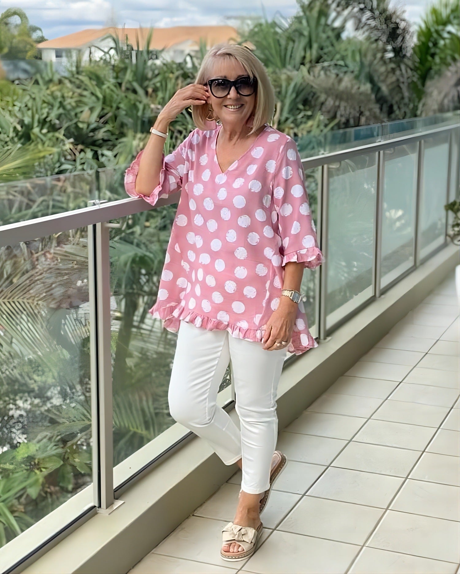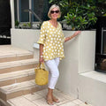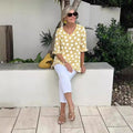 Short Sleeve V-collar Polka Dot Printed Cotton And Linen T
